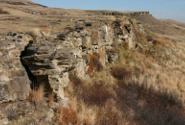 Head Smashed in Buffalo Jump is a cliff on the prairies where the ground begins to roll as it approaches the Rocky Mountains. The natives determined that one of the most effect ways to hunt the large Buffalo was to use gravity as their weapon and would manipulate, direct, chase and hope that they could get the Buffalo to stampede along a route which would take them right over the cliff's edge and plunge to their death on the sharp rocks - in some cases 100 feet below.  Any Buffalo that were badly injured and not killed would then be pounced upon by the additional natives waiting below, and butchered with the weapons they had.