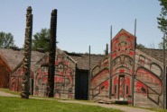 The village reflects the traditional ways with the houses forming a line all of which face the river. As with may of the Northwest native groups, he front of the houses are decorated with native art work and totem poles. Some of the houses which form a part of the community are the smoke house, where the large yearly salmon catch was laid out and smoked in order to preserve the food source for the rest of the year, and the food cache house where the food can be stored.